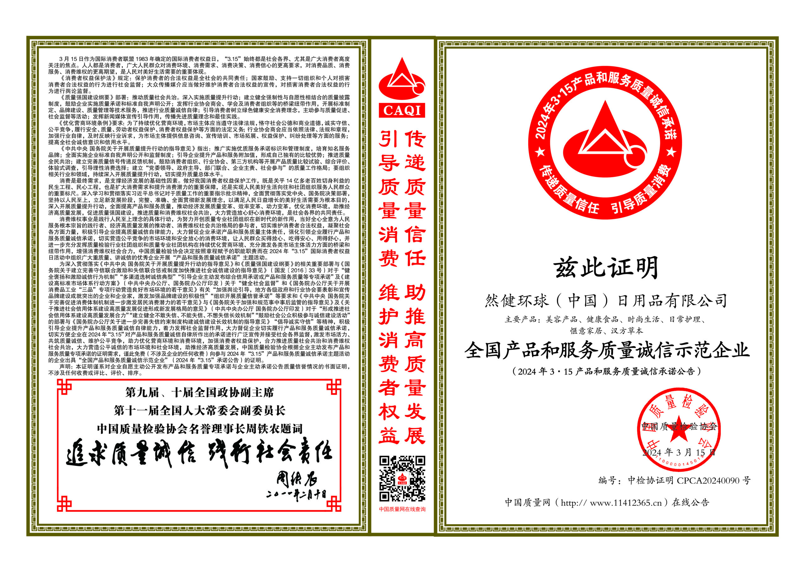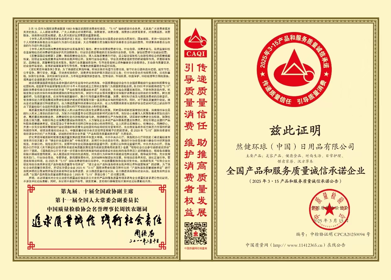 Honored by the China Association for Quality Inspection as a “National Model Enterprise for Product and Service Quality Integrity.”
